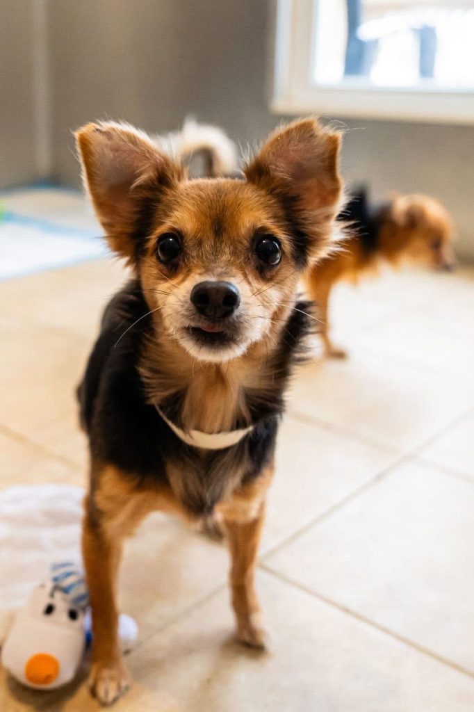 Sofia is a 8-10 year old chihuahua mix. This sweet toy lady came to us from a home of 15+ dogs. She has a past that has made her wise, but gentle. She takes some time warming up to new people, but we do not blame her at all. A few treats, and a little patience go a long way. She deserves the softest beds in the coziest home, and weβre going to make sure she gets there. She does love her crate, but will need some more time and training for the scary leash, and going potty in the snow. Meet and greets are required with existing dogs in the home.